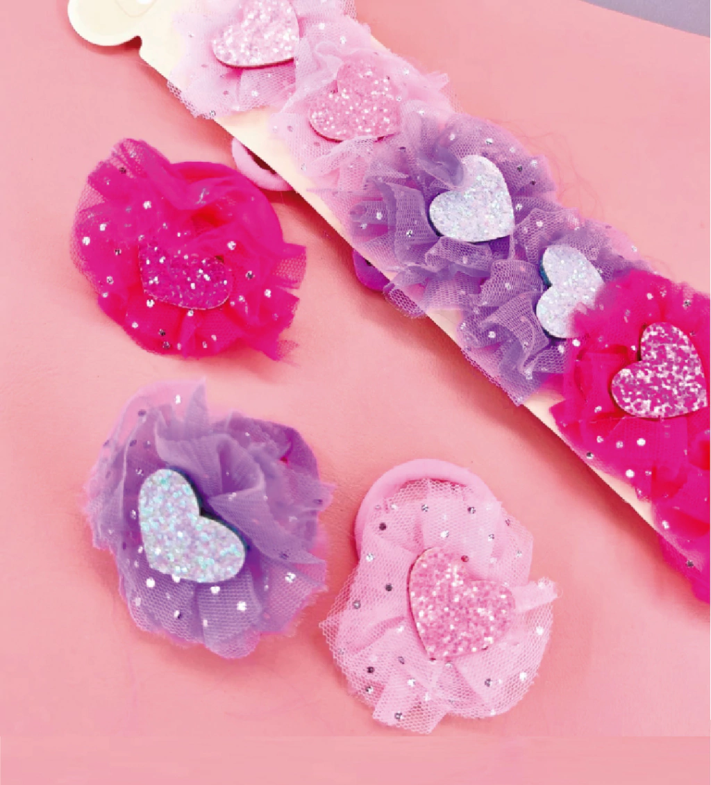 Colitas para pelo elásticas, las cuales tienen forma de corazón forradas con lentejuelas y un tul a su alrededor.